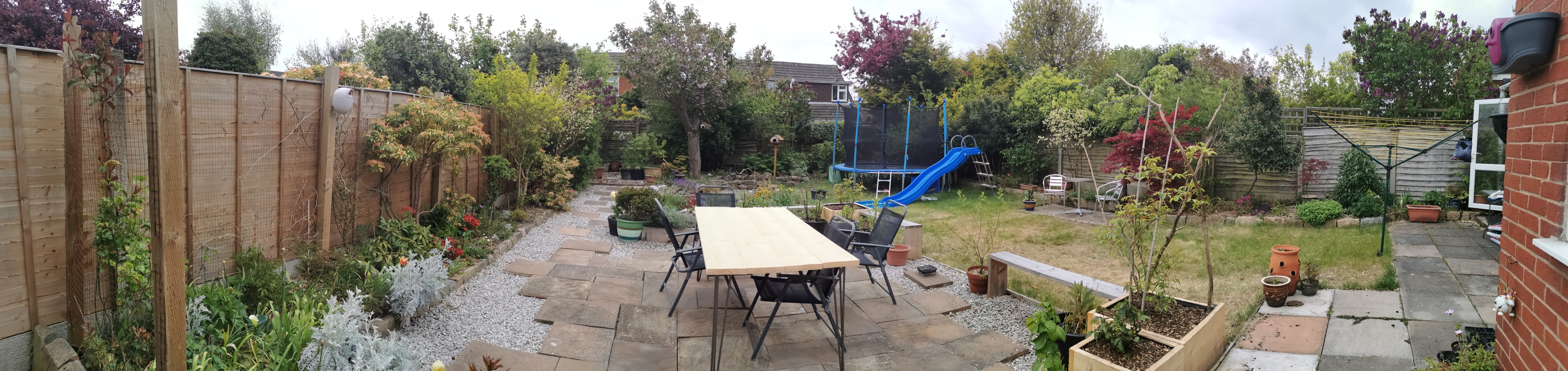 I still had several boards left (damn you, reality, for making me change my initial plans) so I also knocked up a dining table as well - literally a case of four lengths of scaffold board with two strips of board underneath to hold them together, and four steel legs I bought online that screwed into the corners. All of a sudden, we had a well-defined space with the same wooden planters on the corners and for the table and the benches to unify everything.